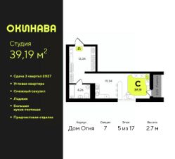 1-комн. квартира-студия с предчистовой отделкой в ЖК "Окинава" на 5 этаже. Общая площадь: 39.19 кв.м., площадь гостиной 19.34 кв.м., из которых 5 кв.м. выделено под кухонную зону. Квартира угловая, очень светлая, естественная вентиляция при открытии окон. В квартире одна лоджия, один совмещенный санузел. Высота потолков 2.7 м.