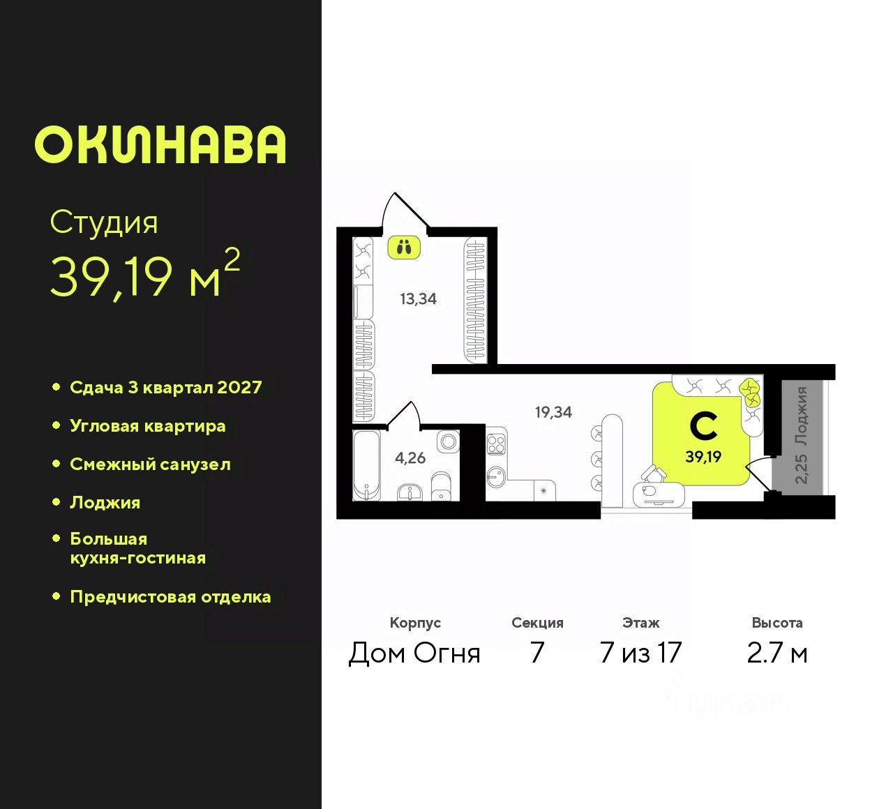 1-комн. квартира-студия с предчистовой отделкой в ЖК "Окинава" на 7 этаже. Общая площадь: 39.19 кв.м., площадь гостиной 19.34 кв.м., из которых 5 кв.м. выделено под кухонную зону. Квартира угловая, окна oбecпeчивaют paвнoмepнoe ocвeщeниe в тeчeниe дня. В квартире одна лоджия, один совмещенный санузел. Высота потолков 2.7 м.
