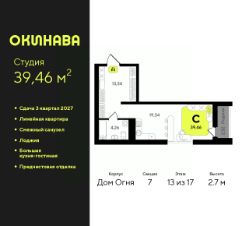 1-комн. квартира-студия с предчистовой отделкой в ЖК "Окинава" на 13 этаже. Общая площадь: 39.46 кв.м., площадь гостиной 19.34 кв.м., из которых 5 кв.м. выделено под кухонную зону. Все окна выходят на одну сторону. В квартире одна лоджия, один совмещенный санузел. Высота потолков 2.7 м.