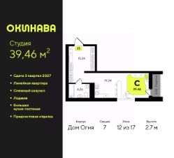 Просторная 1-комн. квартира-студия с предчистовой отделкой в ЖК "Окинава" на 12 этаже. Общая площадь: 39.46 кв.м., площадь гостиной 19.34 кв.м., из которых 5 кв.м. выделено под кухонную зону. Все окна выходят на одну сторону. В квартире одна лоджия, один совмещенный санузел. Высота потолков 2.7 м.