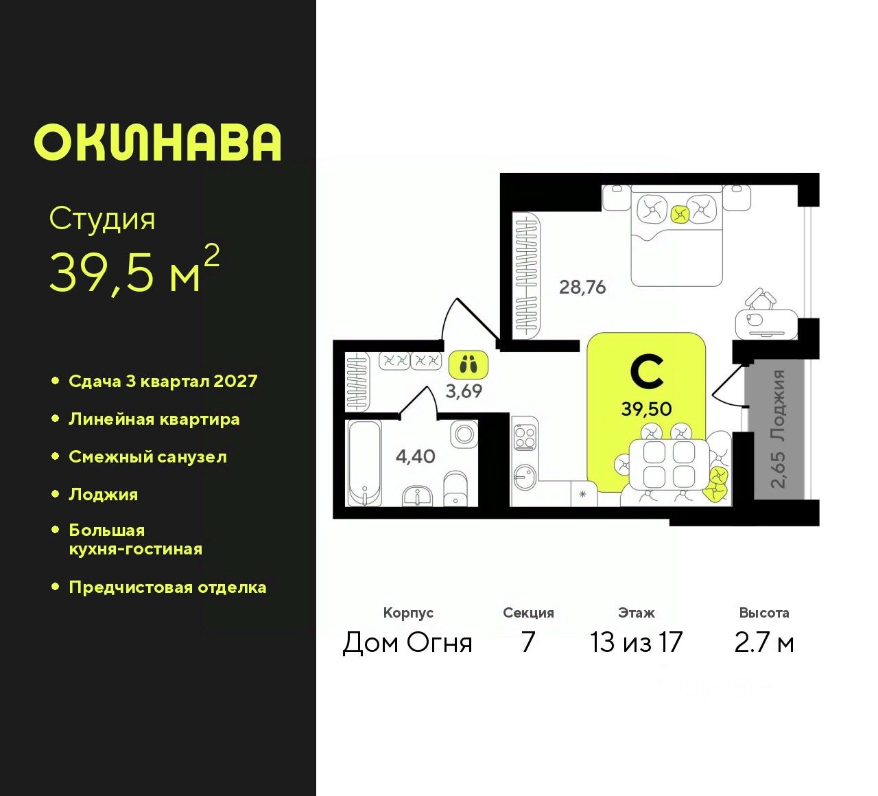 Однокомнатная квартира-студия с предчистовой отделкой в ЖК "Окинава" на 13 этаже. Общая площадь: 39.5 кв.м., площадь гостиной 28.76 кв.м., из которых 5 кв.м. выделено под кухонную зону. Все окна выходят на одну сторону. В квартире одна лоджия, один совмещенный санузел. Высота потолков 2.7 м.