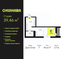 1-комн. квартира-студия с предчистовой отделкой в ЖК "Окинава" на 14 этаже. Общая площадь: 39.46 кв.м., площадь гостиной 19.34 кв.м., из которых 5 кв.м. выделено под кухонную зону. Все окна выходят на одну сторону. В квартире одна лоджия, один совмещенный санузел. Высота потолков 2.7 м.