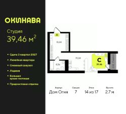 Однокомнатная квартира-студия от застройщика с предчистовой отделкой в ЖК "Окинава" на 14 этаже. Общая площадь: 39.46 кв.м., площадь гостиной 19.34 кв.м., из которых 5 кв.м. выделено под кухонную зону. Все окна выходят на одну сторону. В квартире одна лоджия, один совмещенный санузел. Высота потолков 2.7 м.