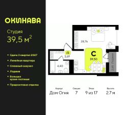 1-комн. квартира-студия с предчистовой отделкой в ЖК "Окинава" на 9 этаже. Общая площадь: 39.5 кв.м., площадь гостиной 28.76 кв.м., из которых 5 кв.м. выделено под кухонную зону. Все окна выходят на одну сторону. В квартире одна лоджия, один совмещенный санузел. Высота потолков 2.7 м.