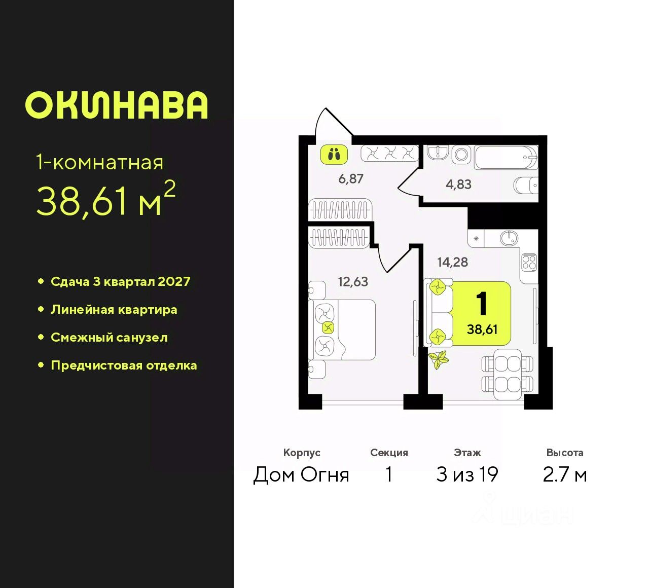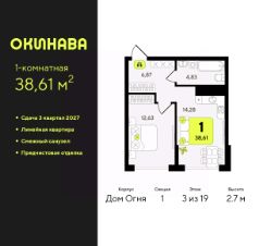 Однокомнатная квартира от застройщика с предчистовой отделкой в ЖК "Окинава" на 3 этаже. Общая площадь: 38.61 кв.м., жилая: 12.63 кв.м., площадь просторной кухни-столовой: 14.28 кв.м. Все окна выходят на одну сторону. В квартире один совмещенный санузел. Высота потолков 2.7 м.