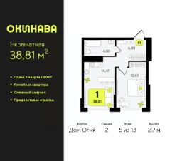1-комн. квартира от застройщика с предчистовой отделкой в ЖК "Окинава" на 5 этаже. Общая площадь: 38.81 кв.м., жилая: 12.63 кв.м., площадь просторной кухни-столовой: 14.47 кв.м. Все окна выходят на одну сторону. В квартире один совмещенный санузел. Высота потолков 2.7 м.