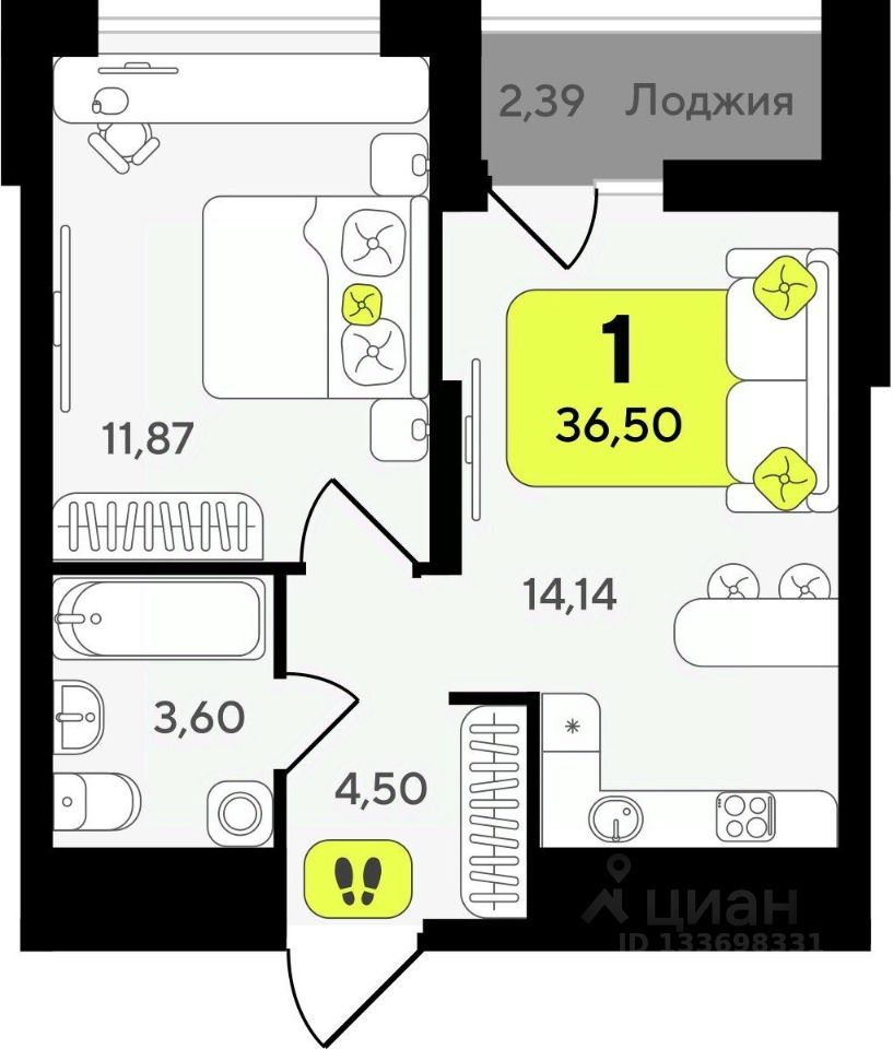 1-комн. квартира с предчистовой отделкой в ЖК "Окинава" на 4 этаже. Общая площадь: 36.5 кв.м., жилая: 11.87 кв.м., площадь просторной кухни-столовой: 14.14 кв.м. Все окна выходят на одну сторону. В квартире одна лоджия, один совмещенный санузел. Высота потолков 2.7 м.