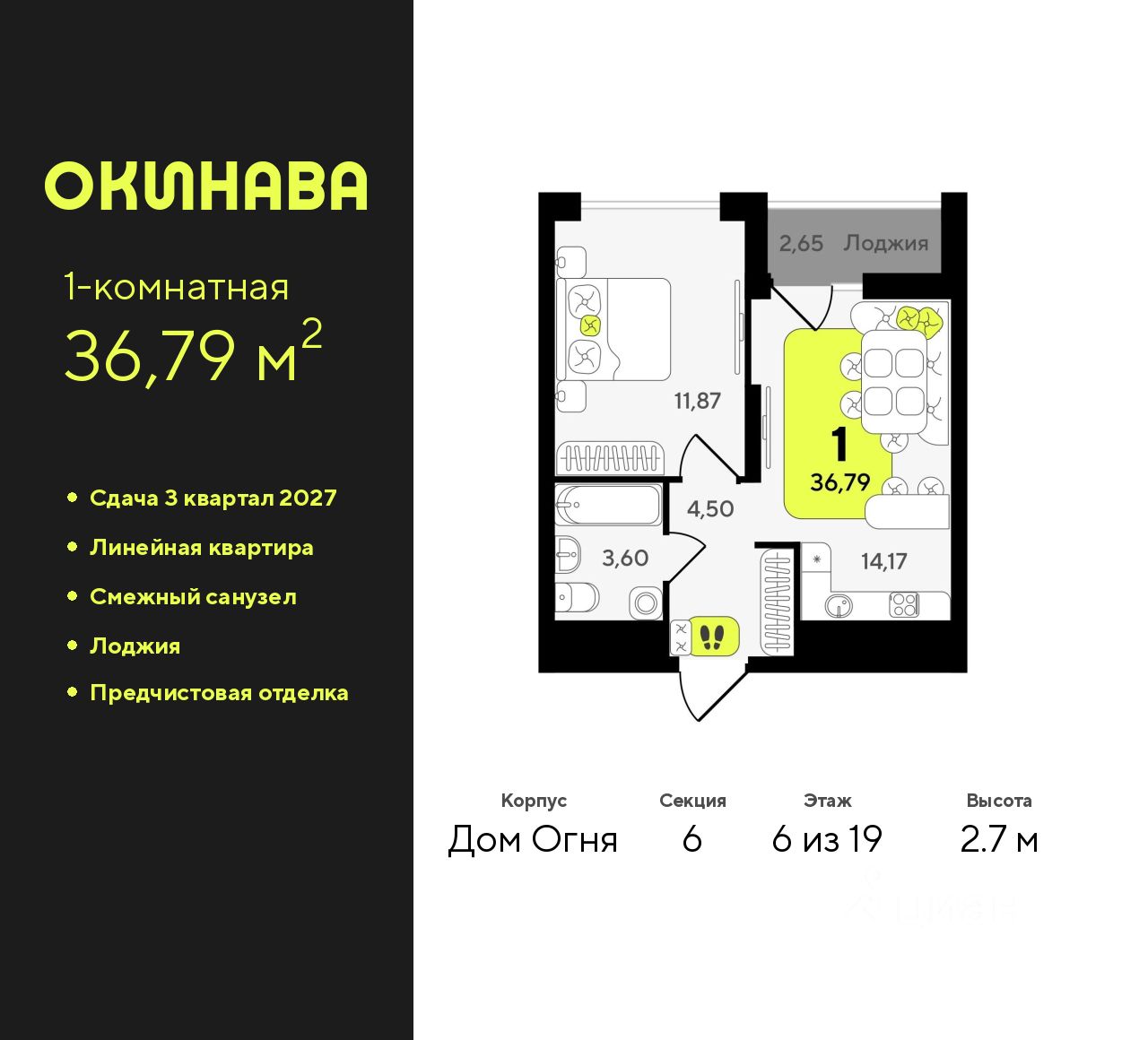 1-комн. квартира от застройщика с предчистовой отделкой в ЖК "Окинава" на 6 этаже. Общая площадь: 36.79 кв.м., жилая: 11.87 кв.м., площадь просторной кухни-столовой: 14.17 кв.м. Все окна выходят на одну сторону. В квартире одна лоджия, один совмещенный санузел. Высота потолков 2.7 м.