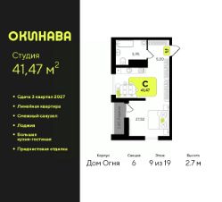 1-комн. квартира-студия от застройщика с предчистовой отделкой в ЖК "Окинава" на 9 этаже. Общая площадь: 41.47 кв.м., площадь гостиной 27.52 кв.м., из которых 5 кв.м. выделено под кухонную зону. Все окна выходят на одну сторону. В квартире одна лоджия, один совмещенный санузел. Высота потолков 2.7 м.