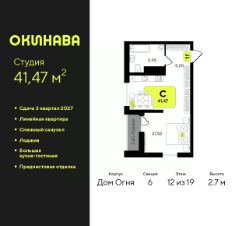 Просторная однокомнатная квартира-студия с предчистовой отделкой в ЖК "Окинава" на 12 этаже. Общая площадь: 41.47 кв.м., площадь гостиной 27.52 кв.м., из которых 5 кв.м. выделено под кухонную зону. Все окна выходят на одну сторону. В квартире одна лоджия, один совмещенный санузел. Высота потолков 2.7 м.