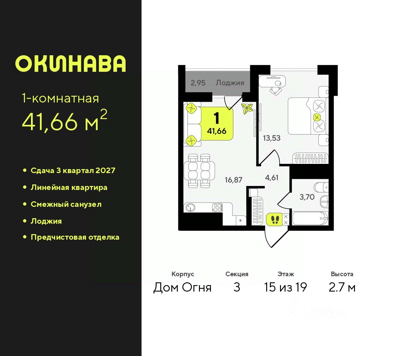 Однокомнатная квартира от застройщика с предчистовой отделкой в ЖК "Окинава" на 15 этаже. Общая площадь: 41.66 кв.м., жилая: 13.53 кв.м., площадь просторной кухни-столовой: 16.87 кв.м. Все окна выходят на одну сторону. В квартире одна лоджия, один совмещенный санузел. Высота потолков 2.7 м.