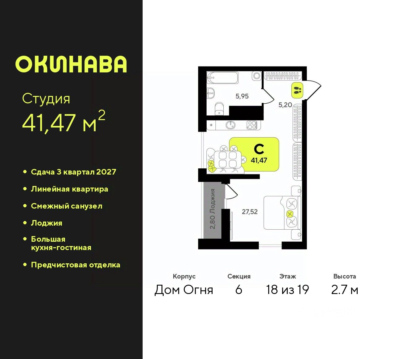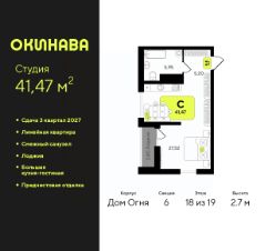 Однокомнатная квартира-студия от застройщика с предчистовой отделкой в ЖК "Окинава" на 18 этаже. Общая площадь: 41.47 кв.м., площадь гостиной 27.52 кв.м., из которых 5 кв.м. выделено под кухонную зону. Все окна выходят на одну сторону. В квартире одна лоджия, один совмещенный санузел. Высота потолков 2.7 м.