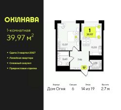 Просторная 1-комн. квартира с предчистовой отделкой в ЖК "Окинава" на 14 этаже. Общая площадь: 39.97 кв.м., жилая: 13.07 кв.м., площадь просторной кухни-столовой: 13.33 кв.м. Все окна выходят на одну сторону. В квартире один совмещенный санузел. Высота потолков 2.7 м.