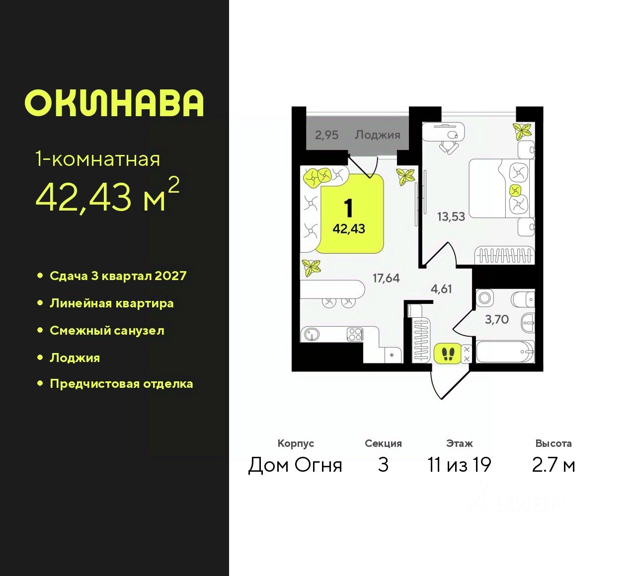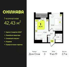 Просторная однокомнатная квартира с предчистовой отделкой в ЖК "Окинава" на 11 этаже. Общая площадь: 42.43 кв.м., жилая: 13.53 кв.м., площадь просторной кухни-столовой: 17.64 кв.м. Все окна выходят на одну сторону. В квартире одна лоджия, один совмещенный санузел. Высота потолков 2.7 м.