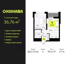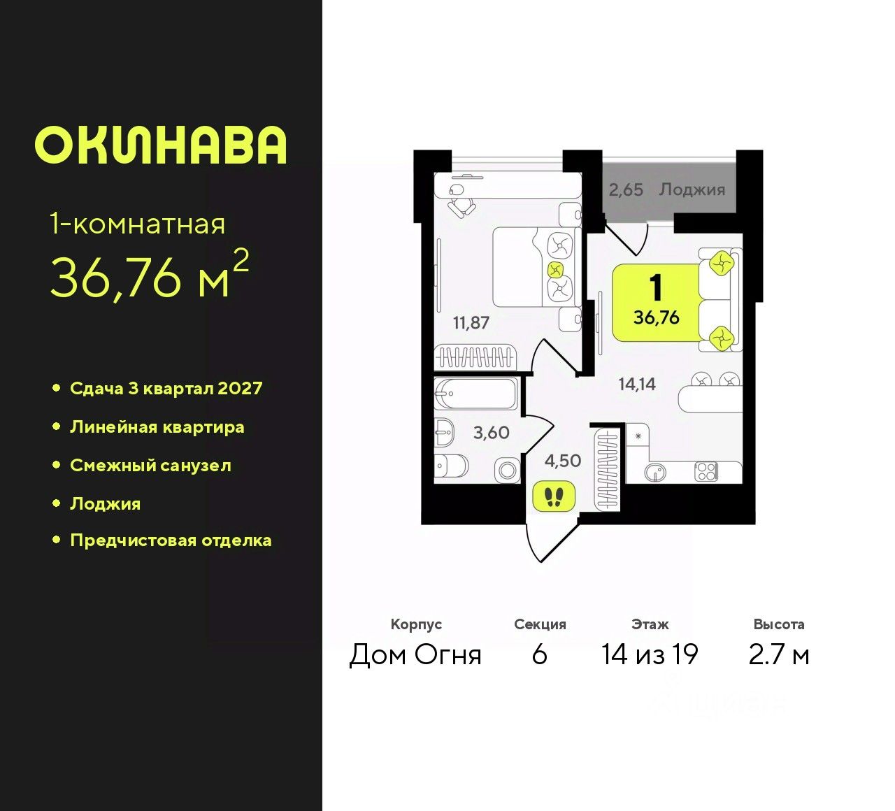 Просторная 1-комн. квартира с предчистовой отделкой в ЖК "Окинава" на 14 этаже. Общая площадь: 36.76 кв.м., жилая: 11.87 кв.м., площадь просторной кухни-столовой: 14.14 кв.м. Все окна выходят на одну сторону. В квартире одна лоджия, один совмещенный санузел. Высота потолков 2.7 м.