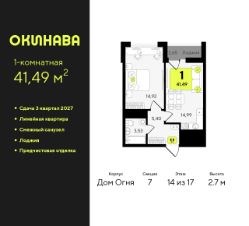 Продается однокомнатная квартира с предчистовой отделкой в ЖК "Окинава" на 14 этаже. Общая площадь: 41.49 кв.м., жилая: 14.92 кв.м., площадь просторной кухни-столовой: 14.99 кв.м. Все окна выходят на одну сторону. В квартире одна лоджия, один совмещенный санузел. Высота потолков 2.7 м.