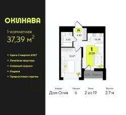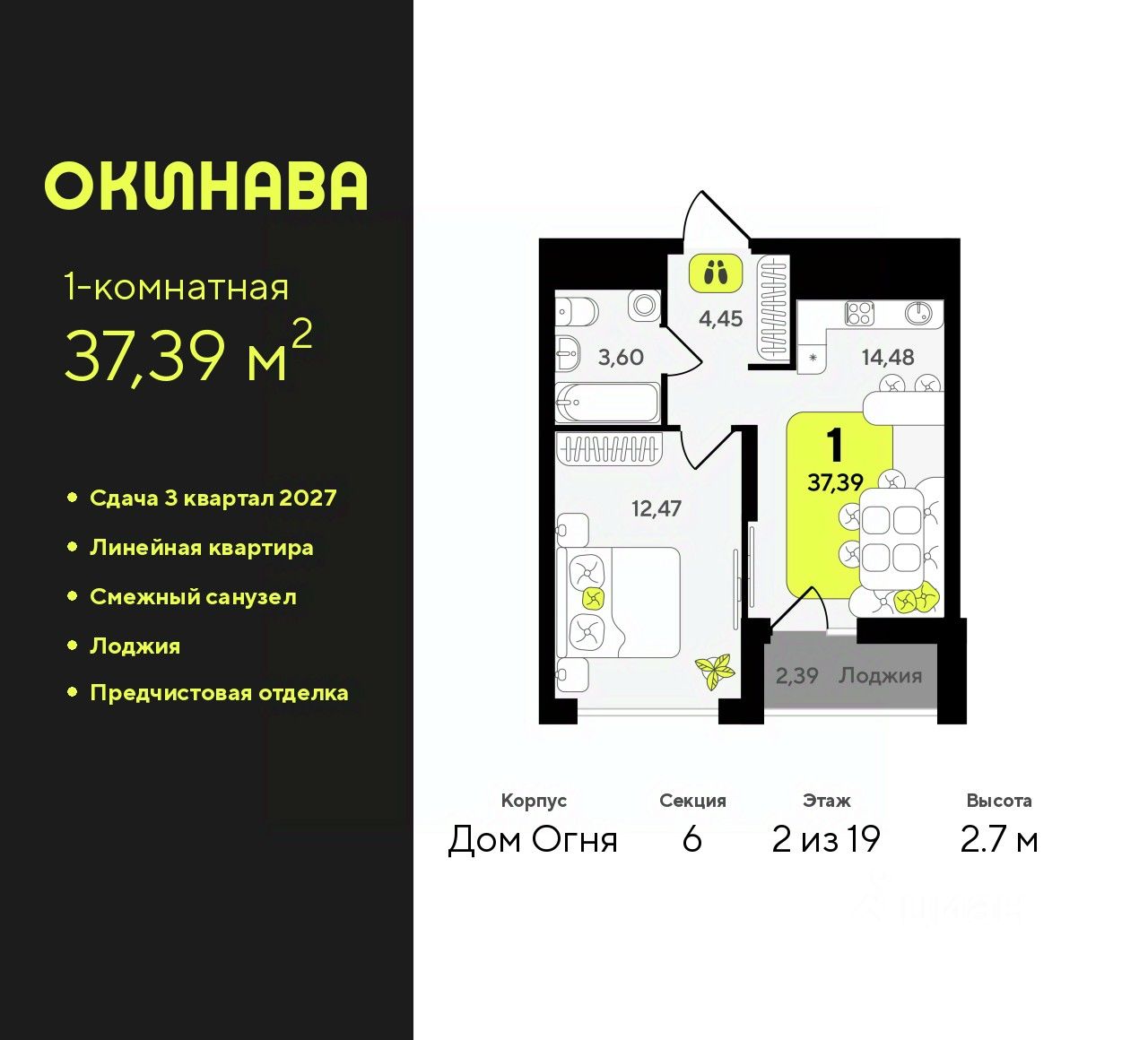 Продается однокомнатная квартира от застройщика с предчистовой отделкой в ЖК "Окинава" на 2 этаже. Общая площадь: 37.39 кв.м., жилая: 12.47 кв.м., площадь просторной кухни-столовой: 14.48 кв.м. Все окна выходят на одну сторону. В квартире одна лоджия, один совмещенный санузел. Высота потолков 2.7 м.