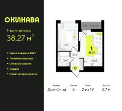 1-комн. квартира с предчистовой отделкой в ЖК "Окинава" на 2 этаже. Общая площадь: 38.27 кв.м., жилая: 11.87 кв.м., площадь просторной кухни-столовой: 15.65 кв.м. Все окна выходят на одну сторону. В квартире одна лоджия, один совмещенный санузел. Высота потолков 2.7 м.