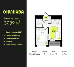 Однокомнатная квартира от застройщика с предчистовой отделкой в ЖК "Окинава" на 3 этаже. Общая площадь: 37.39 кв.м., жилая: 12.47 кв.м., площадь просторной кухни-столовой: 14.48 кв.м. Все окна выходят на одну сторону. В квартире одна лоджия, один совмещенный санузел. Высота потолков 2.7 м.