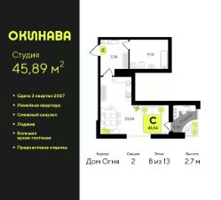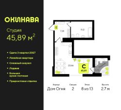1-комн. квартира-студия с предчистовой отделкой в ЖК "Окинава" на 8 этаже. Общая площадь: 45.89 кв.м., площадь гостиной 23.66 кв.м., из которых 5 кв.м. выделено под кухонную зону. Все окна выходят на одну сторону. В квартире одна лоджия, один совмещенный санузел. Высота потолков 2.7 м.