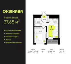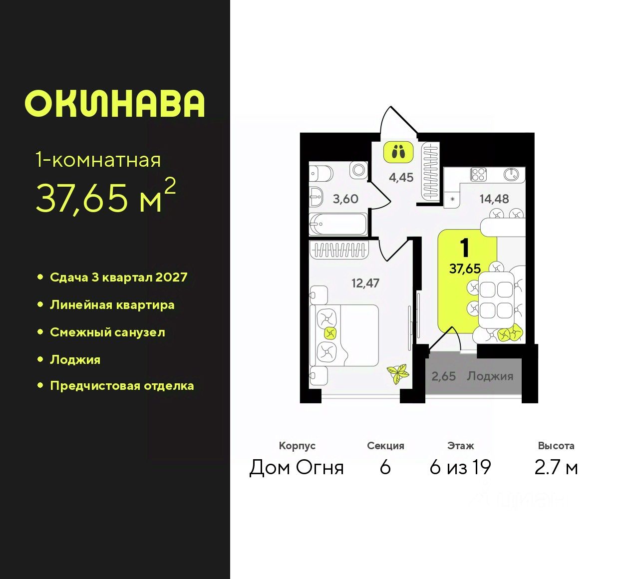 1-комн. квартира от застройщика с предчистовой отделкой в ЖК "Окинава" на 6 этаже. Общая площадь: 37.65 кв.м., жилая: 12.47 кв.м., площадь просторной кухни-столовой: 14.48 кв.м. Все окна выходят на одну сторону. В квартире одна лоджия, один совмещенный санузел. Высота потолков 2.7 м.