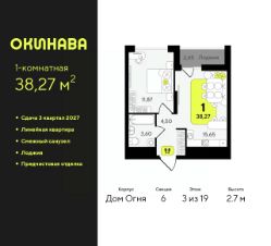 Однокомнатная квартира от застройщика с предчистовой отделкой в ЖК "Окинава" на 3 этаже. Общая площадь: 38.27 кв.м., жилая: 11.87 кв.м., площадь просторной кухни-столовой: 15.65 кв.м. Все окна выходят на одну сторону. В квартире одна лоджия, один совмещенный санузел. Высота потолков 2.7 м.