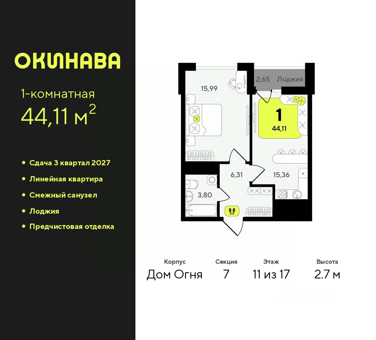 1-комн. квартира с предчистовой отделкой в ЖК "Окинава" на 11 этаже. Общая площадь: 44.11 кв.м., жилая: 15.99 кв.м., площадь просторной кухни-столовой: 15.36 кв.м. Все окна выходят на одну сторону. В квартире одна лоджия, один совмещенный санузел. Высота потолков 2.7 м.