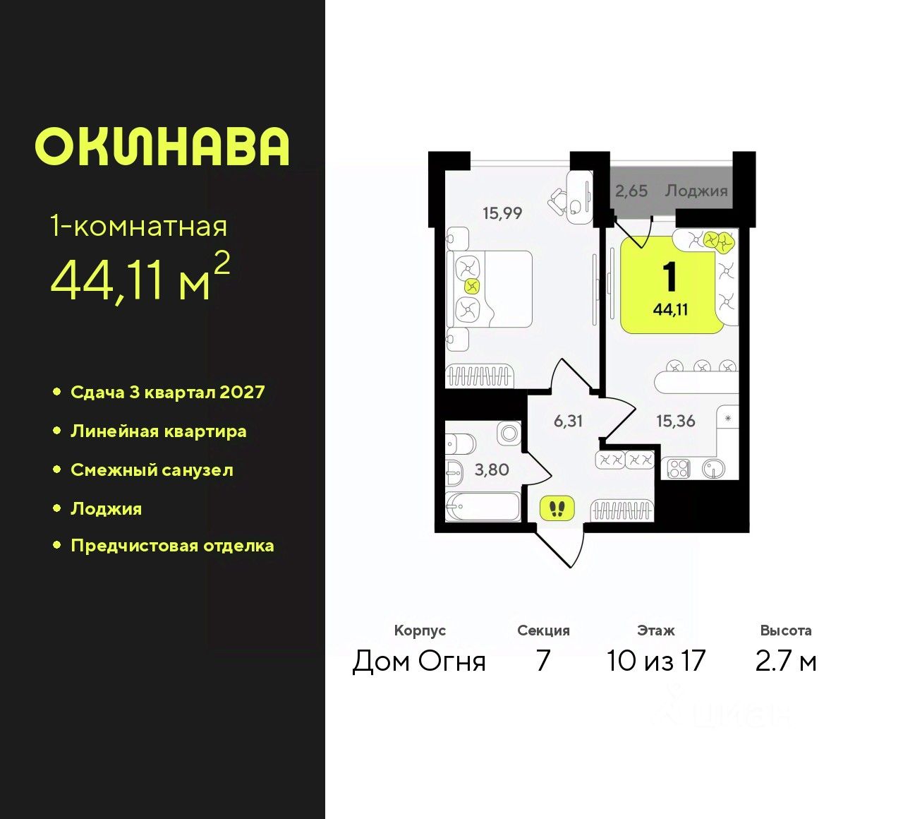 1-комн. квартира с предчистовой отделкой в ЖК "Окинава" на 10 этаже. Общая площадь: 44.11 кв.м., жилая: 15.99 кв.м., площадь просторной кухни-столовой: 15.36 кв.м. Все окна выходят на одну сторону. В квартире одна лоджия, один совмещенный санузел. Высота потолков 2.7 м.