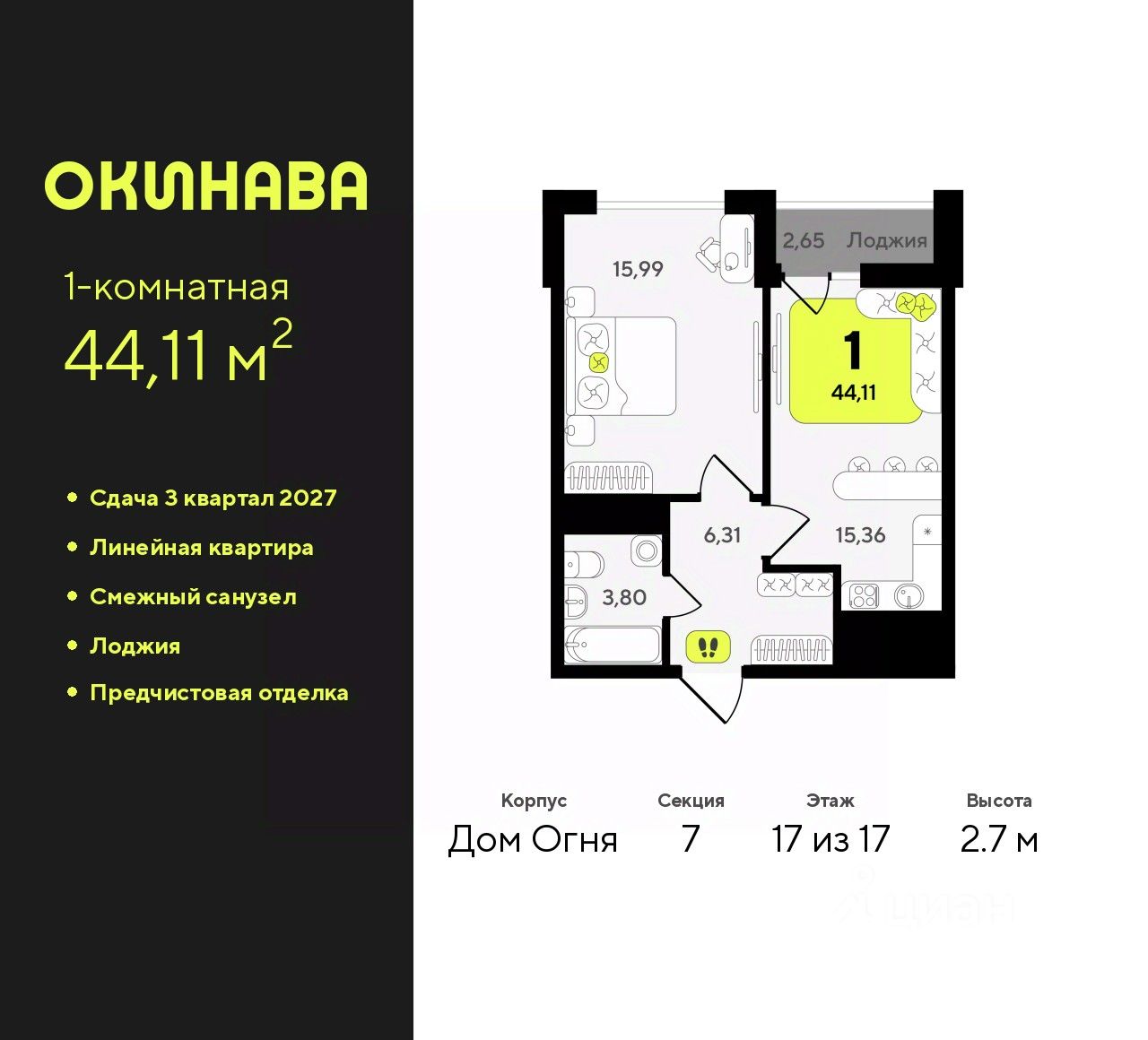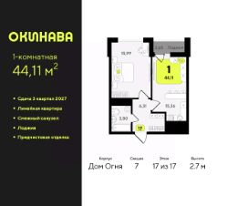 1-комн. квартира от застройщика с предчистовой отделкой в ЖК "Окинава" на 17 этаже. Общая площадь: 44.11 кв.м., жилая: 15.99 кв.м., площадь просторной кухни-столовой: 15.36 кв.м. Все окна выходят на одну сторону. В квартире одна лоджия, один совмещенный санузел. Высота потолков 2.7 м.