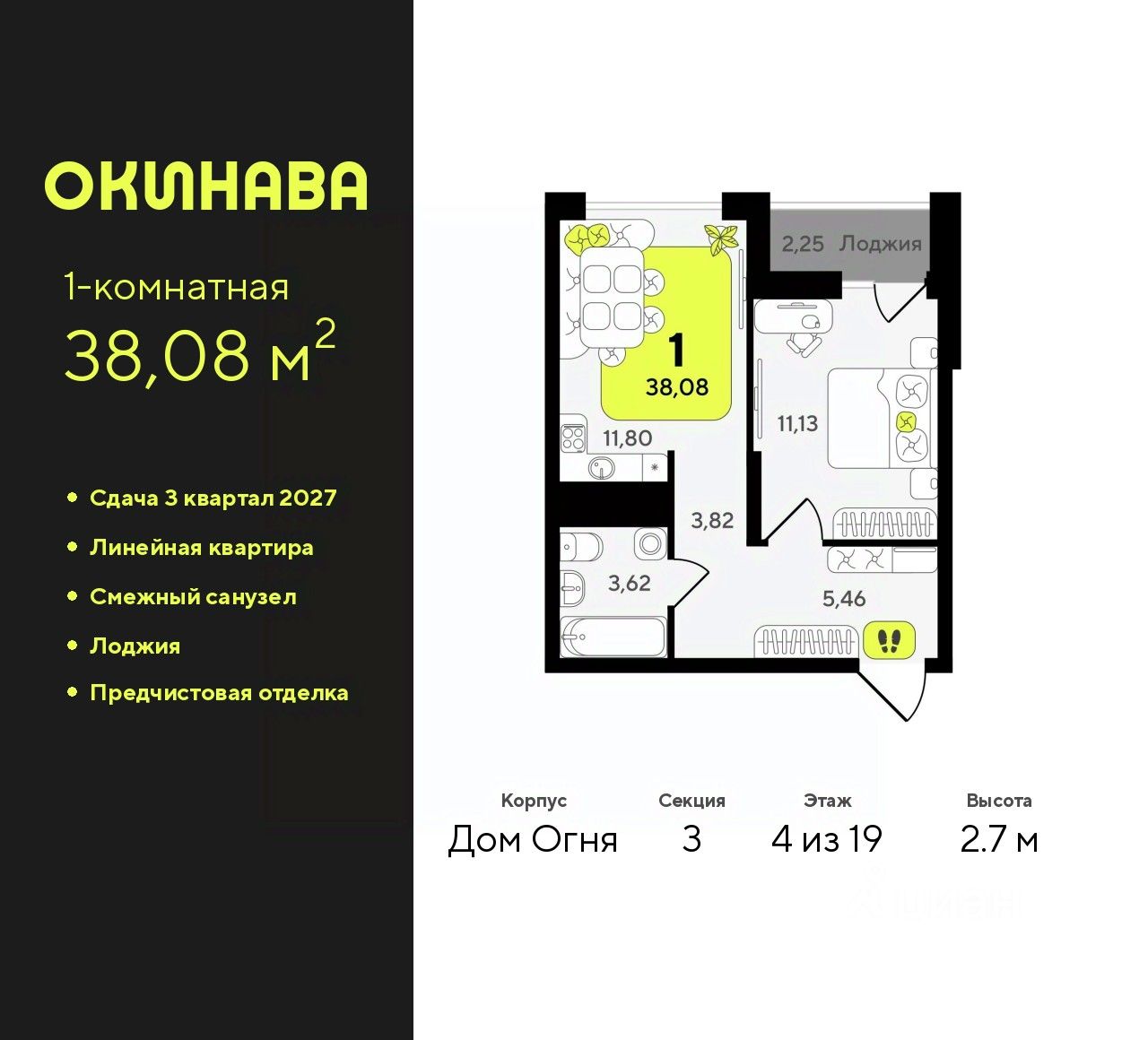 Продается 1-комн. квартира от застройщика с предчистовой отделкой в ЖК "Окинава" на 4 этаже. Общая площадь: 38.08 кв.м., жилая: 11.13 кв.м., площадь просторной кухни-столовой: 11.8 кв.м. Все окна выходят на одну сторону. В квартире одна лоджия, один совмещенный санузел. Высота потолков 2.7 м.