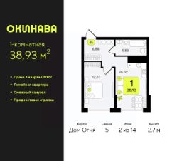 Однокомнатная квартира от застройщика с предчистовой отделкой в ЖК "Окинава" на 2 этаже. Общая площадь: 38.93 кв.м., жилая: 12.63 кв.м., площадь просторной кухни-столовой: 14.59 кв.м. Все окна выходят на одну сторону. В квартире один совмещенный санузел. Высота потолков 2.7 м.