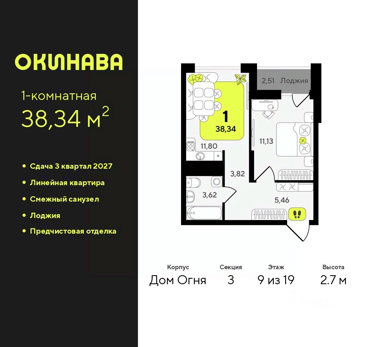 Продается однокомнатная квартира с предчистовой отделкой в ЖК "Окинава" на 9 этаже. Общая площадь: 38.34 кв.м., жилая: 11.13 кв.м., площадь просторной кухни-столовой: 11.8 кв.м. Все окна выходят на одну сторону. В квартире одна лоджия, один совмещенный санузел. Высота потолков 2.7 м.