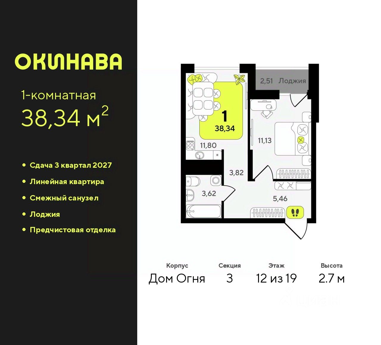 Однокомнатная квартира с предчистовой отделкой в ЖК "Окинава" на 12 этаже. Общая площадь: 38.34 кв.м., жилая: 11.13 кв.м., площадь просторной кухни-столовой: 11.8 кв.м. Все окна выходят на одну сторону. В квартире одна лоджия, один совмещенный санузел. Высота потолков 2.7 м.
