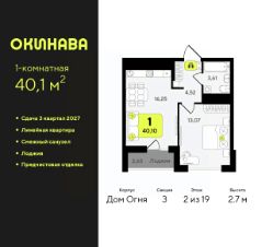 1-комн. квартира от застройщика с предчистовой отделкой в ЖК "Окинава" на 2 этаже. Общая площадь: 40.1 кв.м., жилая: 13.07 кв.м., площадь просторной кухни-столовой: 16.25 кв.м. Все окна выходят на одну сторону. В квартире одна лоджия, один совмещенный санузел. Высота потолков 2.7 м.