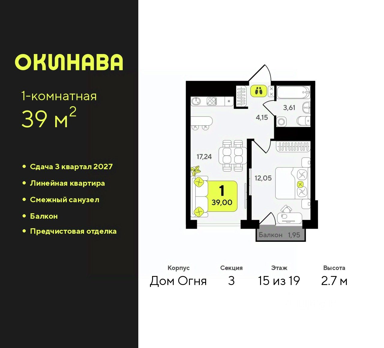 1-комн. квартира с предчистовой отделкой в ЖК "Окинава" на 15 этаже. Общая площадь: 39 кв.м., жилая: 12.05 кв.м., площадь просторной кухни-столовой: 17.24 кв.м. Все окна выходят на одну сторону. В квартире один балкон, один совмещенный санузел. Высота потолков 2.7 м.