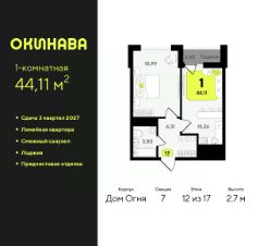Однокомнатная квартира с предчистовой отделкой в ЖК "Окинава" на 12 этаже. Общая площадь: 44.11 кв.м., жилая: 15.99 кв.м., площадь просторной кухни-столовой: 15.36 кв.м. Все окна выходят на одну сторону. В квартире одна лоджия, один совмещенный санузел. Высота потолков 2.7 м.