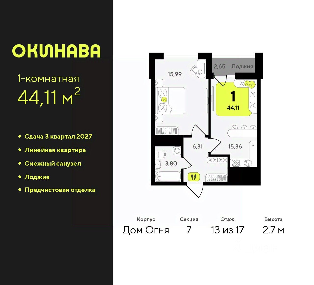 Продается однокомнатная квартира от застройщика с предчистовой отделкой в ЖК "Окинава" на 13 этаже. Общая площадь: 44.11 кв.м., жилая: 15.99 кв.м., площадь просторной кухни-столовой: 15.36 кв.м. Все окна выходят на одну сторону. В квартире одна лоджия, один совмещенный санузел. Высота потолков 2.7 м.