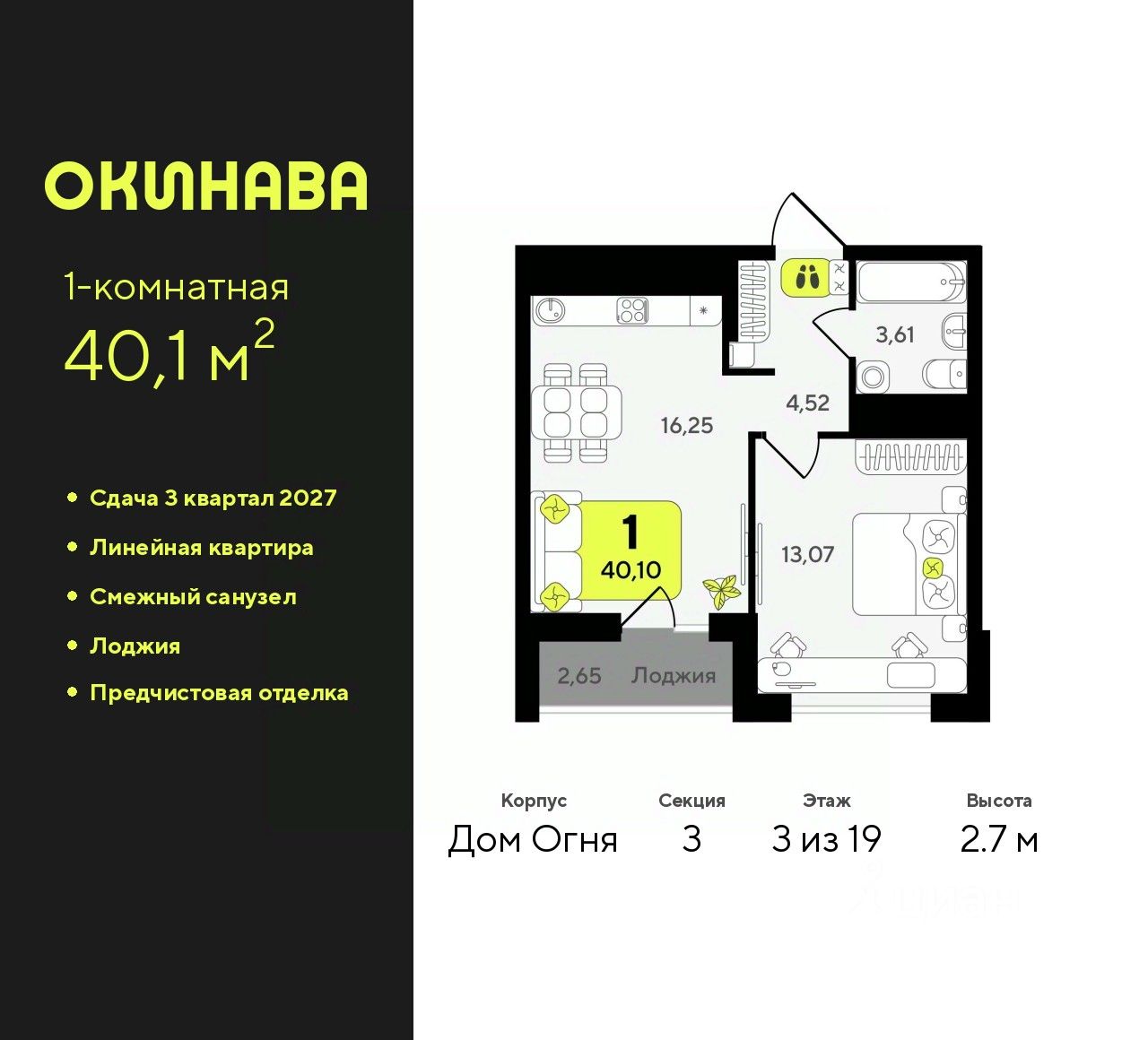 Однокомнатная квартира с предчистовой отделкой в ЖК "Окинава" на 3 этаже. Общая площадь: 40.1 кв.м., жилая: 13.07 кв.м., площадь просторной кухни-столовой: 16.25 кв.м. Все окна выходят на одну сторону. В квартире одна лоджия, один совмещенный санузел. Высота потолков 2.7 м.