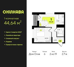 Однокомнатная квартира с предчистовой отделкой в ЖК "Окинава" на 2 этаже. Общая площадь: 44.64 кв.м., жилая: 14.94 кв.м., площадь просторной кухни-столовой: 17.41 кв.м. Все окна выходят на одну сторону. В квартире одна лоджия, один совмещенный санузел. Высота потолков 2.7 м.