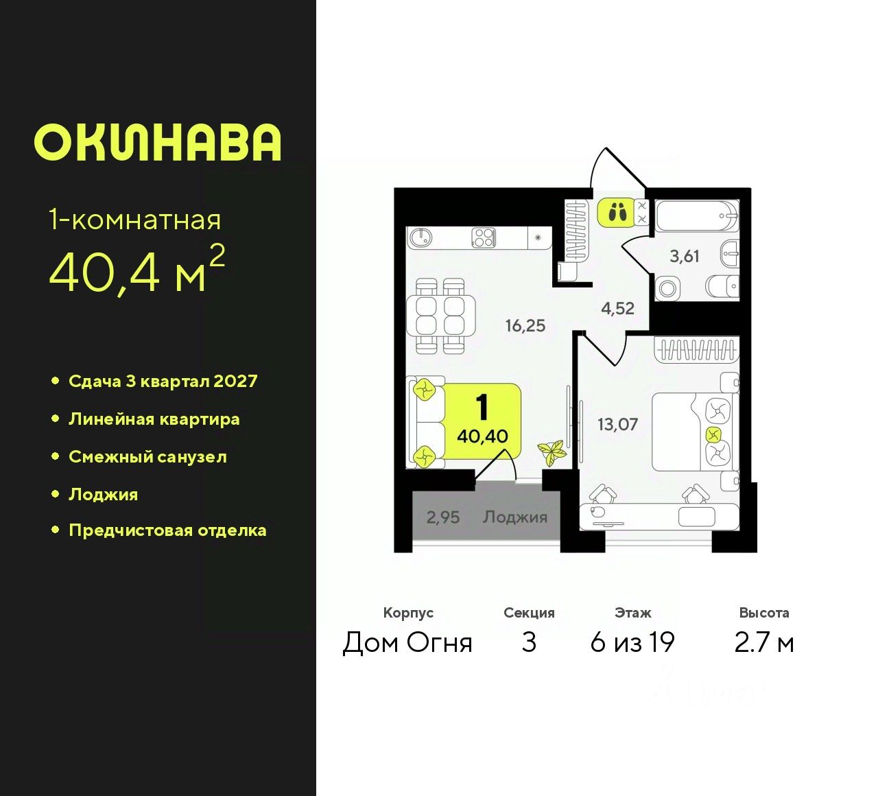 1-комн. квартира от застройщика с предчистовой отделкой в ЖК "Окинава" на 6 этаже. Общая площадь: 40.4 кв.м., жилая: 13.07 кв.м., площадь просторной кухни-столовой: 16.25 кв.м. Все окна выходят на одну сторону. В квартире одна лоджия, один совмещенный санузел. Высота потолков 2.7 м.