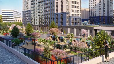 Между домами раскинется большой двухуровневый пешеходный бульвар. Первый уровень прогулочный с местами для отдыха, амфитеатром и фонтанами. На втором уровне расположатся площадки для детей, спортивных игр и тренировок. Квартал будет располагать богатой инфраструктурой: на первых этажах разместятся магазины, пекарни, кофейни, пункты выдачи, аптеки, детские центры, цветочные салоны и многое другое, что сделает жизнь поистине комфортной. В жилом комплексе есть кладовые, а также несколько видов паркинга: уличный гостевой, закрытый теплый и паркинг в стилобате, попасть в который можно на лифте с любого жилого этажа.