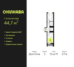 Просторная однокомнатная квартира с предчистовой отделкой в ЖК "Окинава" на 13 этаже. Общая площадь: 44.7 кв.м., жилая: 12.13 кв.м., площадь просторной кухни-столовой: 16.05 кв.м. Квартира - распашонка, без проходных комнат, окна выходят на paзные стороны дома. В квартире одна лоджия, два совмещенных санузла. Высота потолков 2.7 м.