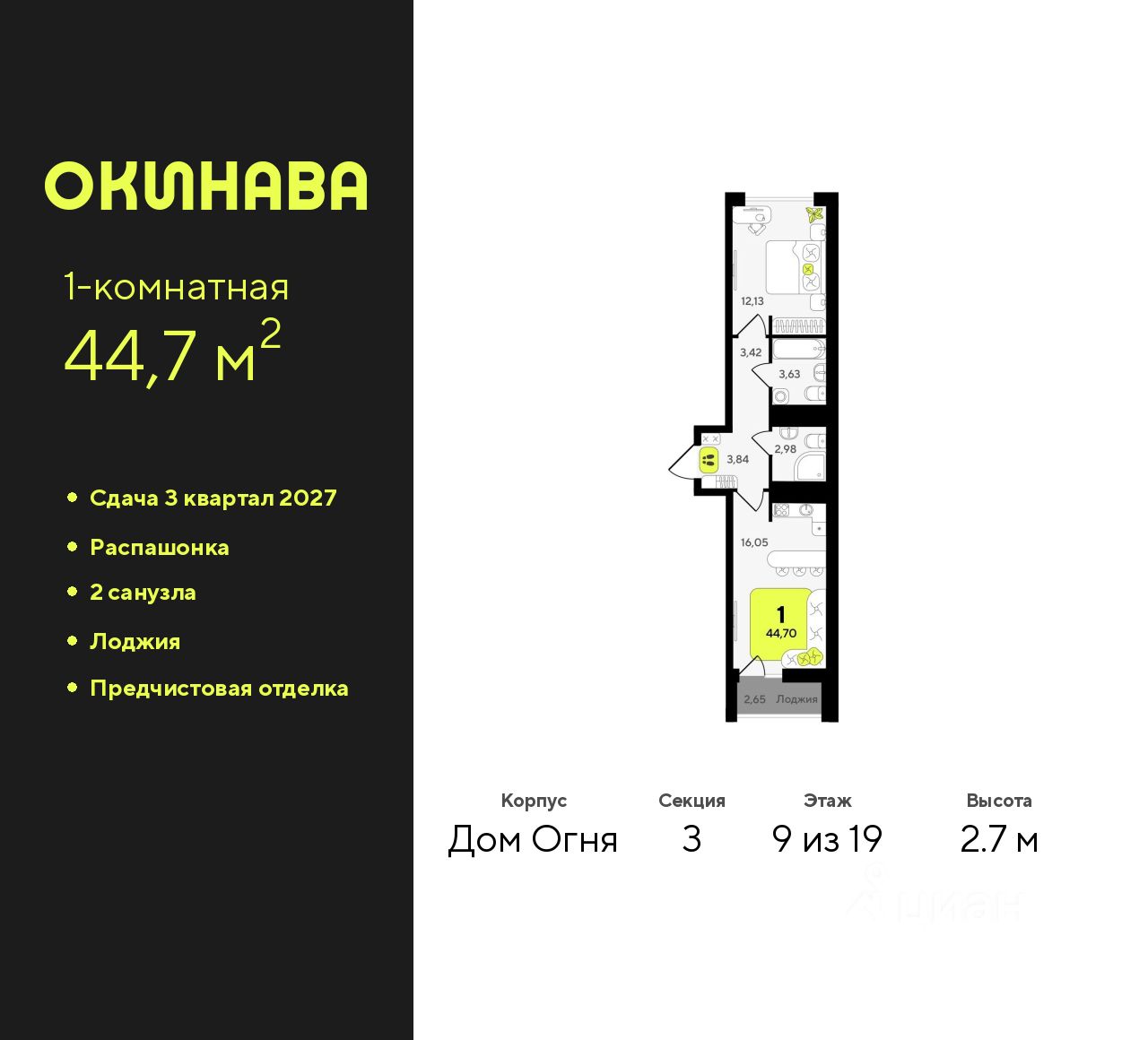 Просторная однокомнатная квартира с предчистовой отделкой в ЖК "Окинава" на 9 этаже. Общая площадь: 44.7 кв.м., жилая: 12.13 кв.м., площадь просторной кухни-столовой: 16.05 кв.м. Квартира - распашонка, без проходных комнат, окна выходят на paзные стороны дома. В квартире одна лоджия, два совмещенных санузла. Высота потолков 2.7 м.