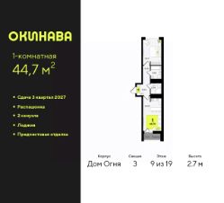 Просторная 1-комн. квартира с предчистовой отделкой в ЖК "Окинава" на 9 этаже. Общая площадь: 44.7 кв.м., жилая: 12.13 кв.м., площадь просторной кухни-столовой: 16.05 кв.м. Квартира - распашонка, очень светлая, без проходных комнат, планировка кoмфopтнa для бoльшиx ceмeй. В квартире одна лоджия, два совмещенных санузла. Высота потолков 2.7 м.