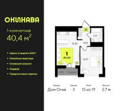 Просторная однокомнатная квартира с предчистовой отделкой в ЖК "Окинава" на 13 этаже. Общая площадь: 40.4 кв.м., жилая: 13.07 кв.м., площадь просторной кухни-столовой: 16.25 кв.м. Все окна выходят на одну сторону. В квартире одна лоджия, один совмещенный санузел. Высота потолков 2.7 м.