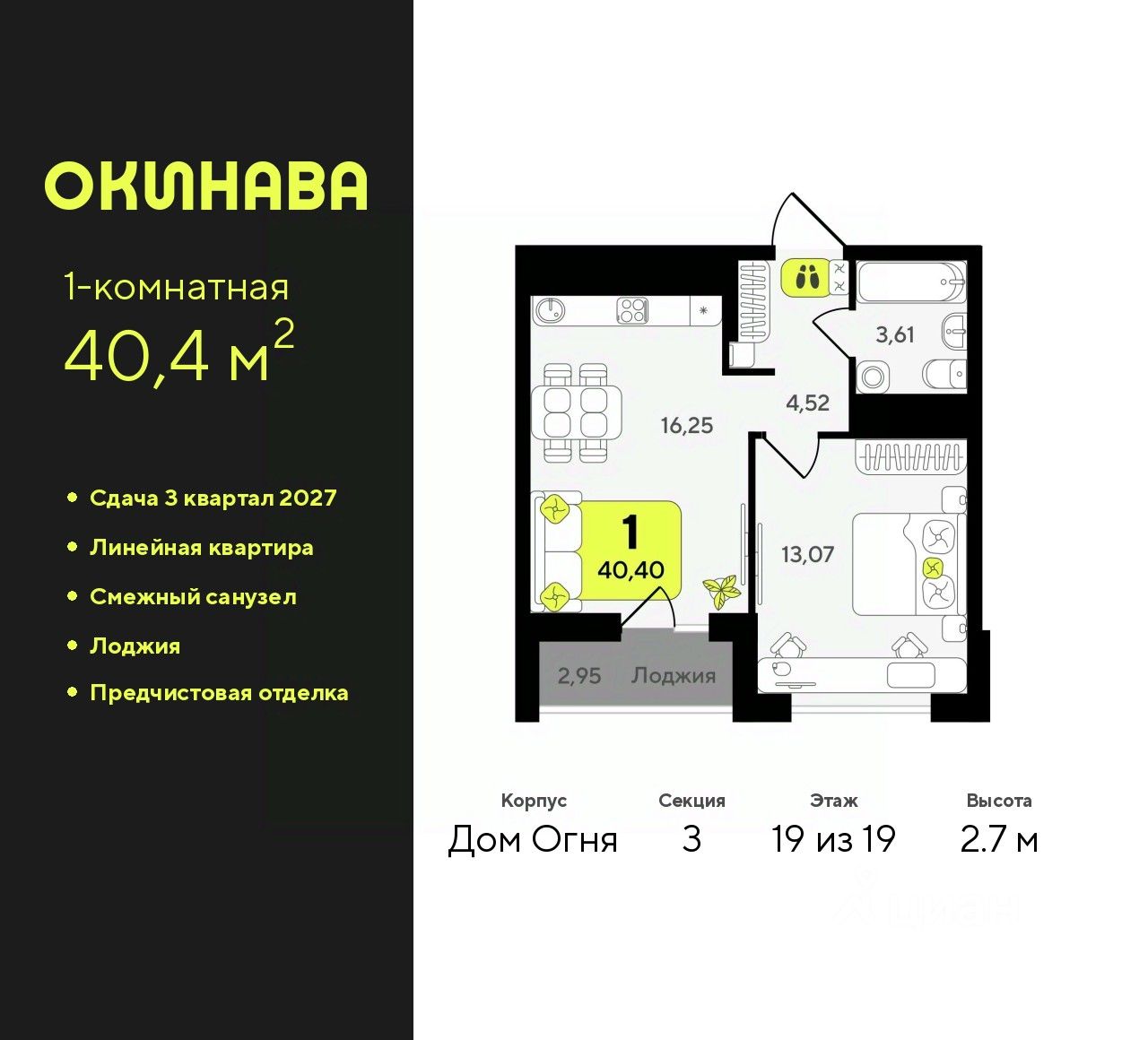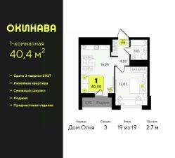 Однокомнатная квартира с предчистовой отделкой в ЖК "Окинава" на 19 этаже. Общая площадь: 40.4 кв.м., жилая: 13.07 кв.м., площадь просторной кухни-столовой: 16.25 кв.м. Все окна выходят на одну сторону. В квартире одна лоджия, один совмещенный санузел. Высота потолков 2.7 м.