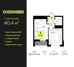 1-комн. квартира от застройщика с предчистовой отделкой в ЖК "Окинава" на 16 этаже. Общая площадь: 40.4 кв.м., жилая: 13.07 кв.м., площадь просторной кухни-столовой: 16.25 кв.м. Все окна выходят на одну сторону. В квартире одна лоджия, один совмещенный санузел. Высота потолков 2.7 м.