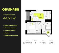 Продается 1-комн. квартира с предчистовой отделкой в ЖК "Окинава" на 14 этаже. Общая площадь: 44.91 кв.м., жилая: 14.94 кв.м., площадь просторной кухни-столовой: 17.41 кв.м. Все окна выходят на одну сторону. В квартире одна лоджия, один совмещенный санузел. Высота потолков 2.7 м.
