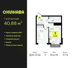 1-комн. квартира с предчистовой отделкой в ЖК "Окинава" на 8 этаже. Общая площадь: 40.88 кв.м., жилая: 12.63 кв.м., площадь просторной кухни-столовой: 14.59 кв.м. Все окна выходят на одну сторону. В квартире один балкон, один совмещенный санузел. Высота потолков 2.7 м.