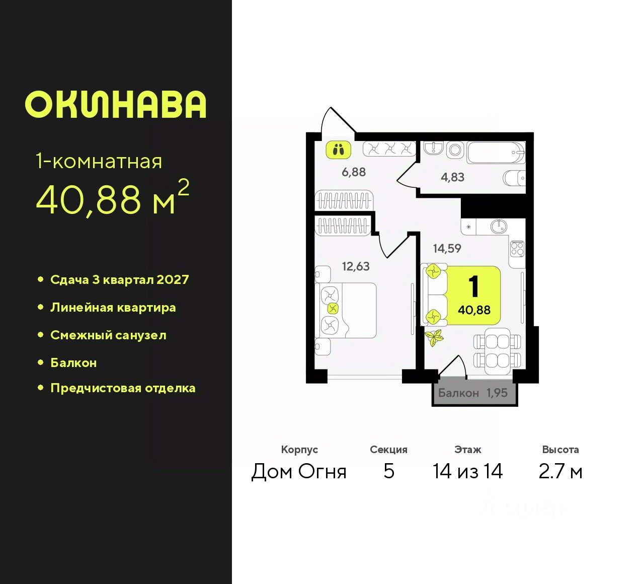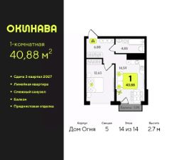 1-комн. квартира от застройщика с предчистовой отделкой в ЖК "Окинава" на 14 этаже. Общая площадь: 40.88 кв.м., жилая: 12.63 кв.м., площадь просторной кухни-столовой: 14.59 кв.м. Все окна выходят на одну сторону. В квартире один балкон, один совмещенный санузел. Высота потолков 2.7 м.